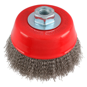 Carda copa ondulada alambre delgado de acero inoxidable 5" x 0.30 mm con rosca 5/8" Urrea
