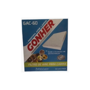 Filtro de cabina modelo GAC60 que mejora la calidad del aire interior de tu vehículo. Atrapa polvo, polen y partículas contaminantes, proporcionando un ambiente más saludable para los ocupantes.