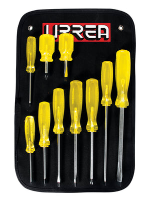 Juego de destornilladores con mango ámbar combinados, 10 piezas en estuche Urrea-Contiene: Estándar Redonda: 3/16"X4", 1/4"X4", 1/4"X1 1/2" -