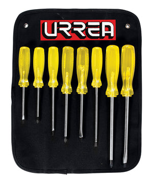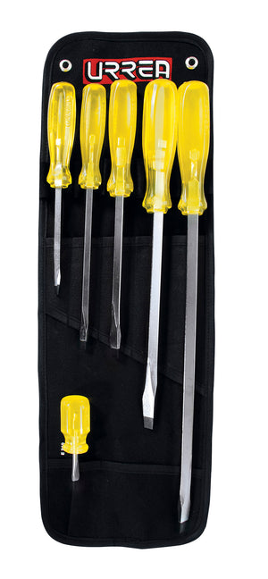 Juego de destornilladores con mango ámbar combinados, 6 piezas en estuche Urrea-Contiene: Estándar Redonda: 1/4"X1 1/2" - Estándar Cuadrada: