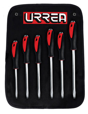 Juego de destornilladores con mango bimaterial de golpe, punta plana, 6 piezas en estuche Urrea