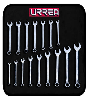 Juego de llaves combinadas pulido espejo en pul y mét, 12 puntas, 16 piezas en estuche Urrea-Contenido (Medidas): 1/4"- 3/4", 8Mm-15Mm