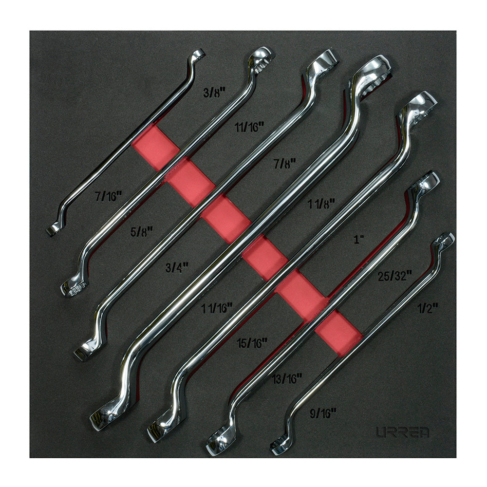 Juego de llaves de estrías 45° en pulgadas 7 piezas, CH213-C Urrea-Contenido (Medidas): 3/8"X7/16"-1 1/16"X1 1/8"