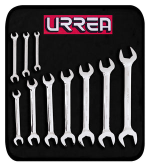 Juego de llaves españolas pulido espejo métricas, 10 piezas en estuche Urrea-Contenido (Medidas): 6 X 7 Mm - 8 X 9 Mm - 10 X 11 Mm - 12 X 13 Mm - 14